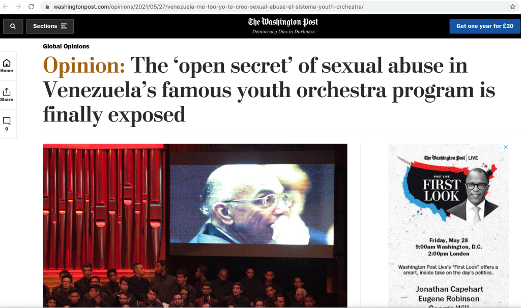On 27 May, an article that I co-authored with William Cheng appeared in the Washington Post. It tackles a difficult subject that I have been investigating for a decade: sexual harassment and abuse within Venezuela’s El Sistema.