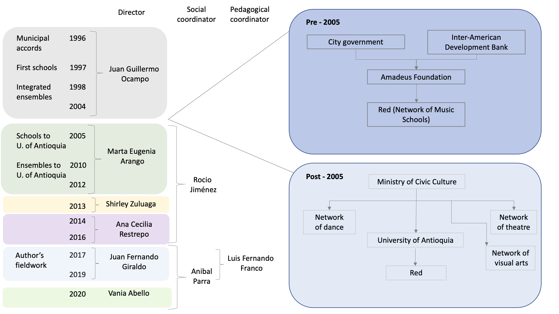Timeline and institutional affiliations of the Network of Music Schools of Medellín